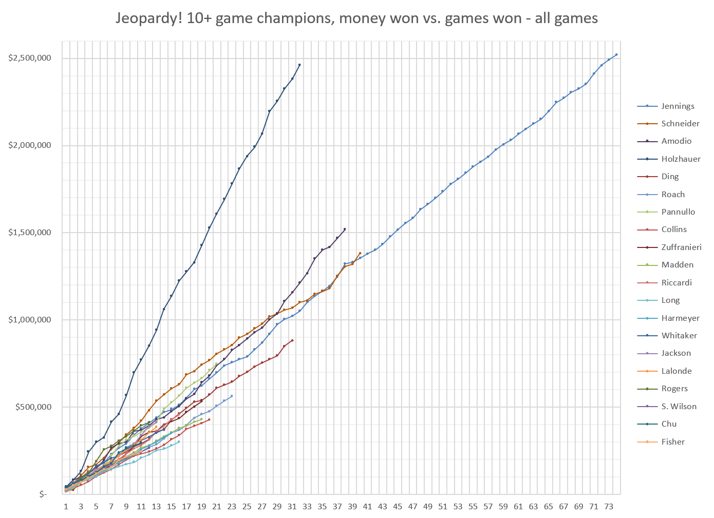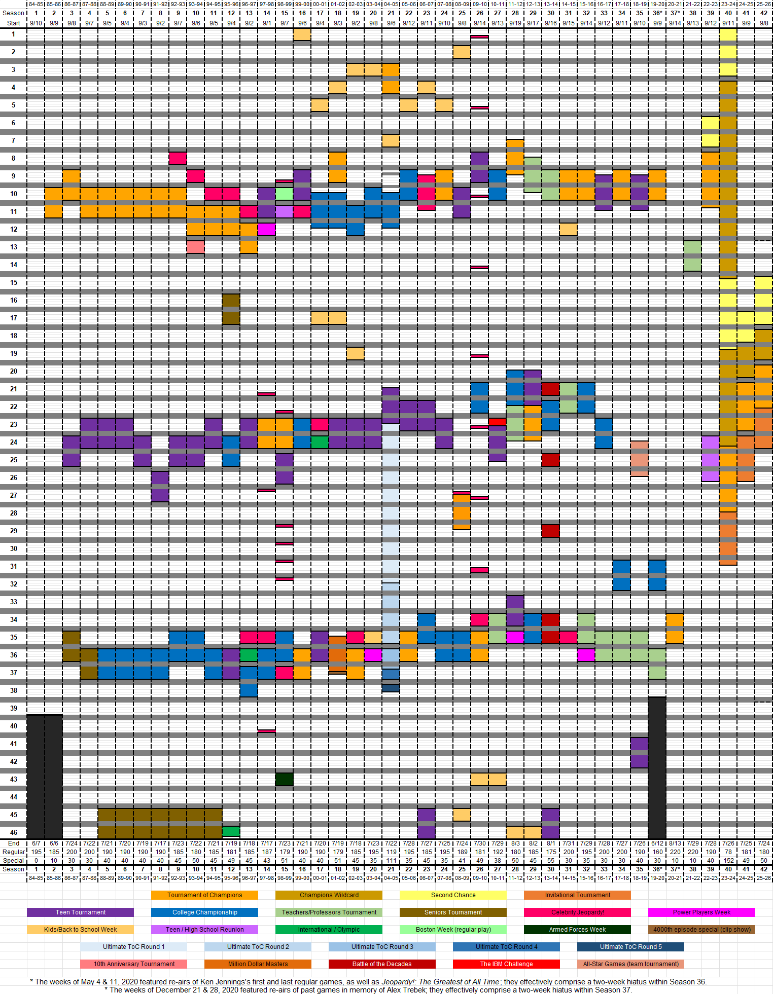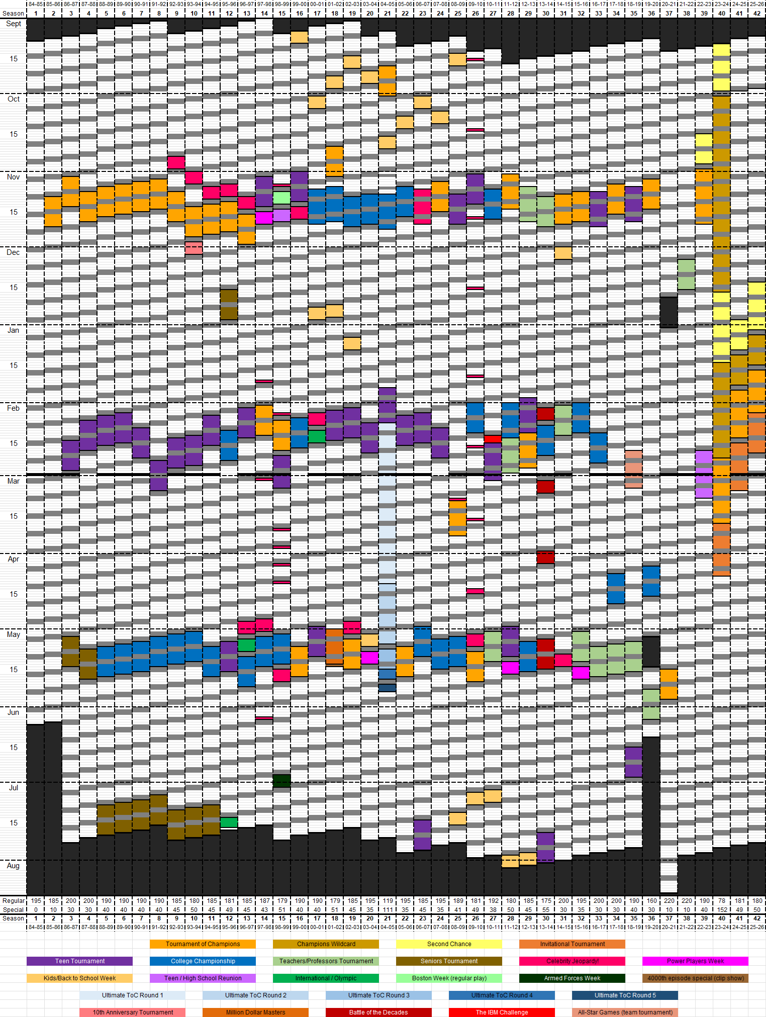 In the summer of 2014 I started watching America's Favorite Quiz Show regularly again, as the reruns of the Battle of the Decades were airing. This led to a lot of new websites discovered and a lot of Tweeting over the course of Season 31. I've started to compile some data about the show; this page serves as a repository for those pages, as well as important links.